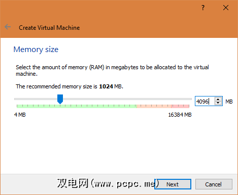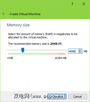 使用滑块或键入要提供给VM的RAM值(以兆字节为单位)。由于计算机计算字节的方式与人类计算字节的方式不同,因此将您提供的RAM的GB乘以 1,024 。因此,如果您要在VM中拥有4GB的RAM,请输入 4,096 ,而不是 4,000 。