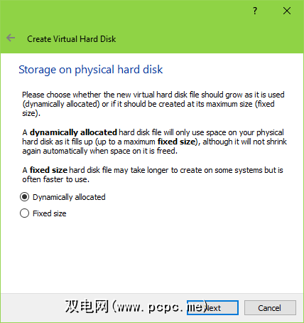 然后,您需要确定是否要动态或固定磁盘。动态磁盘会随着您使用最大容量而增长,而固定磁盘是从一开始就设置的。如果您只是在虚拟机中玩,动态分配将可以工作单击下一步。