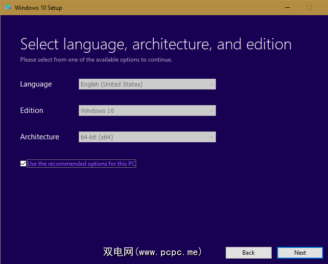 下载该工具后,启动它,然后您可以选择升级自己的工具。 PC或创建安装媒体。选择创建安装媒体选项,然后在下一页上仔细检查选项。确保版本是 Windows 10 ,并且体系结构是 64位(x64)。如果不正确,请取消选中使用此PC的推荐选项框并进行修复。