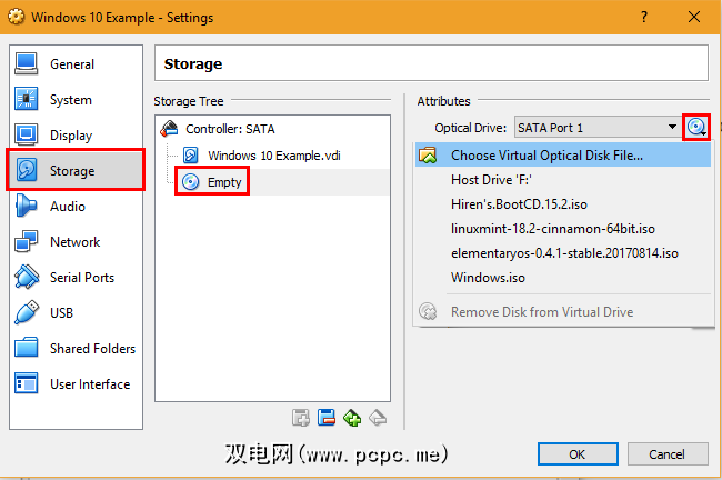 为此,请在VirtualBox的主菜单中突出显示您的VM,然后单击设置。访问左侧的存储标签,您应该在存储树框中看到一个CD图标。单击该图标,然后单击右侧带有箭头的CD。选择选择虚拟光盘文件,然后浏览到保存 Windows.iso 文件的位置。