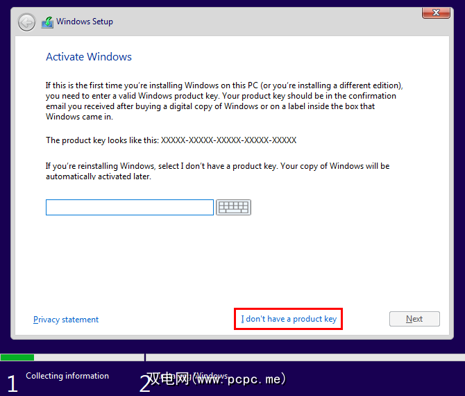 如果您拥有一个产品密钥(有效的Windows 7或8产品密钥也可以使用),则可以立即输入。如果没有,只需单击我没有产品密钥。使用未激活的Windows 10副本有一些限制,但可以很好地用于虚拟机。