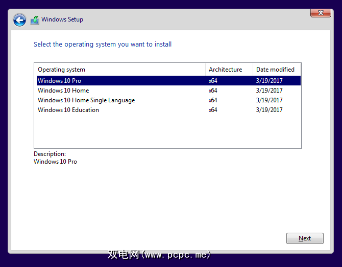 下一步,您将选择要安装的Windows 10版本。如果您具有Windows 10 Home或Pro的产品密钥,请选择匹配的版本。