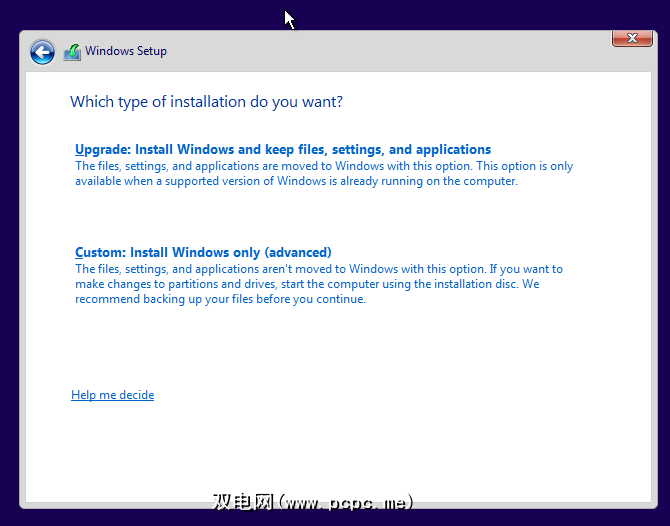 下一步,您可以在升级和自定义安装之间进行选择。由于您要在空白的虚拟磁盘上安装Windows,因此无法选择升级,因此请选择自定义。