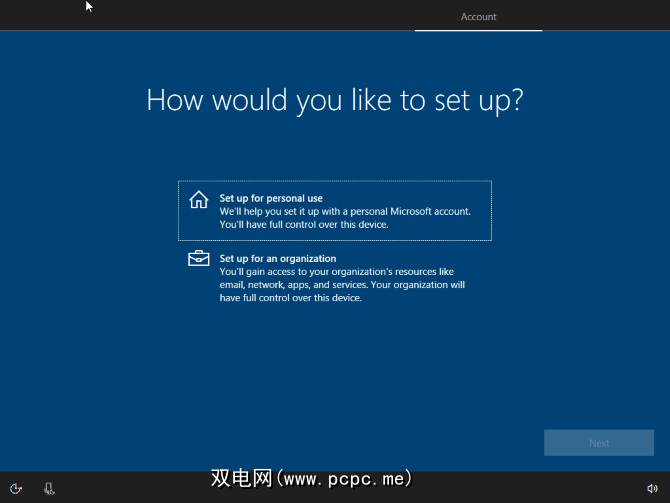 此后,虚拟Windows安装将检查更新。等待它们安装,然后Cortana会询问您的PC是您自己的PC还是属于组织。选择设置为个人使用。