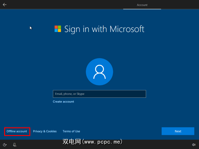 Windows希望您使用Microsoft帐户登录,因此系统会提示您输入电子邮件地址或创建新帐户。尽管使用Microsoft帐户有很多好处,但您可能不想为VM使用一个帐户。在这种情况下,请选择左下角的脱机帐户。无论如何,它将困扰您创建一个Microsoft帐户。点击稍后再输入。