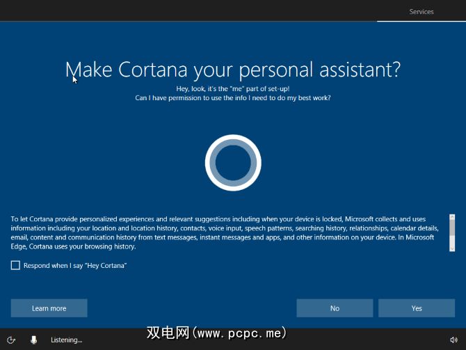 现在,您必须决定是否使用Cortana。她可以做很多事情,如果您是Windows 10的新用户,则可能需要检查一下。选择是或否继续。