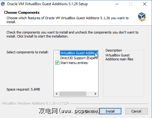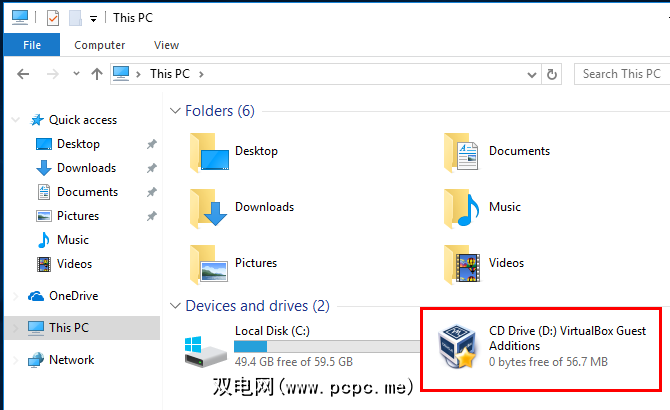 然后,通过访问 Devices> Install Guest来安装Guest Additions CD。在VirtualBox的菜单栏中添加CD映像。要启动它,请从屏幕底部的任务栏打开文件资源管理器,然后单击左侧的此PC 。双击 CD驱动器图标以安装Guest Additions。当看到提示输入管理员权限的提示时,单击是。