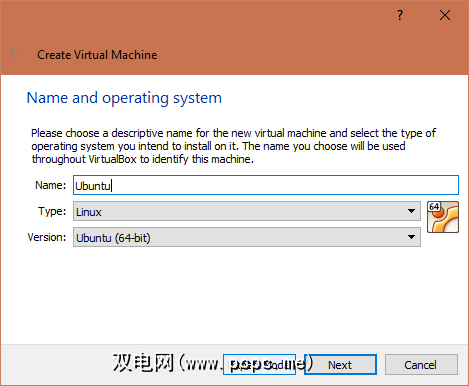 打开VirtualBox,然后单击蓝色的 New 按钮开始制造新计算机。为新的VM赋予唯一的名称- Ubuntu 就可以了。如果类型和版本不会自动更改名称,请确保将它们设置为 Linux 和 Ubuntu(64 -bit),然后点击下一步。 Windows关于32位和64位操作系统的讨论也适用于此-如果您使用的是64位计算机,则应安装64位版本的Ubuntu。