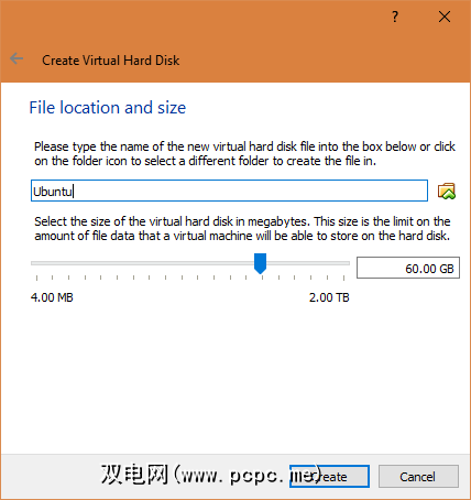 另一个选项是固定大小磁盘。这将从一开始就以其最大大小创建磁盘。因此,它最初会占用更多空间,但与动态磁盘相比,速度可能会有所提高。您可以决定自己喜欢哪个。在此示例中,我们将使用动态。这样一来,如果您在VM中没有安装太多,就不会浪费固定磁盘的空间。