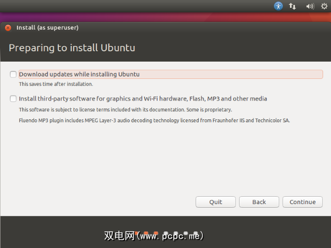 下一步,您可以选中两个框以节省一些时间。顶部将在安装Ubuntu时下载最新更新。第二个框提供了安装第三方软件(如图形和网络驱动程序)以及Flash和其他常见格式的插件的功能。