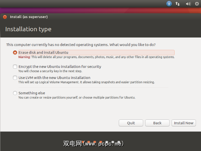 由于您的VM为空白,Ubuntu接下来询问您如何安装它。您需要使用默认的擦除磁盘并安装Ubuntu 。您还可以选择加密安装并根据需要使用LVM。由于这是VM,因此两者都不是必需的。单击立即安装,然后在提示符下单击继续。