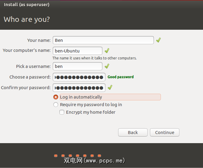 如果您选择自动登录,Ubuntu将在启动后自动自动登录您的帐户。由于这是VM,因此为了方便起见,您可能需要检查此选项。否则,您必须像其他任何计算机一样输入密码才能登录。如果您不需要更高的安全性,也可以选择加密您的主文件夹,尽管您不需要对VM进行加密。
