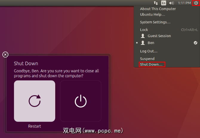 您将看到一个“终端"窗口弹出并贯穿安装过程。当您看到按Return键以关闭此窗口时,请按 Enter 。然后,您需要重新启动。点击桌面右上角的齿轮/电源图标,然后选择关闭,然后点击重启按钮。