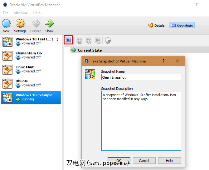 鉴于VM的本质,您可能会不时地在其中进行一些潜在的危险活动。下次您要测试可疑文件或执行注册表黑客攻击时,请先为您的VM拍摄快照。这样一来,您无需重新安装操作系统即可轻松地返回干净状态。