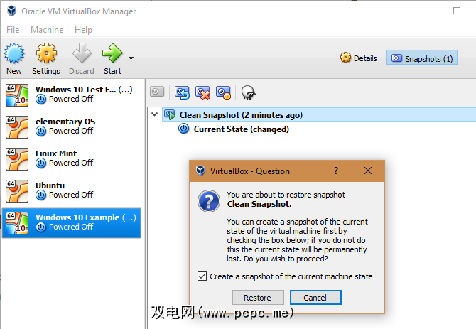 保存快照后,无需做任何其他操作,直到要恢复快照为止。假设您正在测试某种恶意软件,并且您的VM损坏了。关闭计算机,然后在VirtualBox的主菜单中选择其条目。