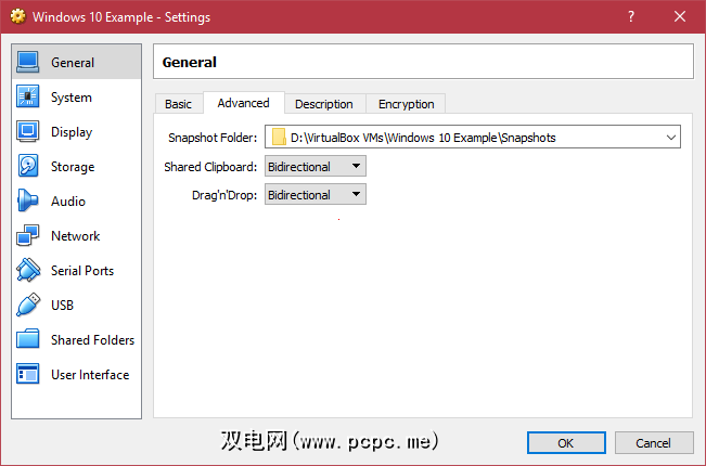 要获得更好的兼容性,您可以启用一些功能,以便轻松地在自己的PC和VM之间移动信息。单击虚拟机上的设置,然后在常规类别上,打开高级选项卡。