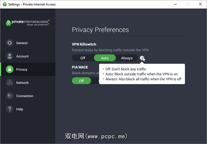 您可能要启用的一件事是 VPN Killswitch 。这将阻止在未打开VPN的情况下往返于计算机的任何流量。 PIA默认情况下会自动执行此操作,但是将其设置为始终会在VPN不运行时阻止您的连接,从而进一步保护您。