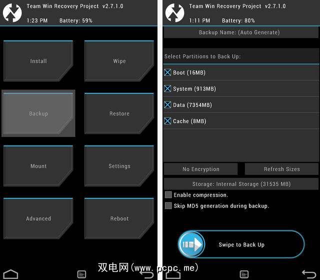 接下来显示的屏幕取决于您使用的是TWRP还是CWM,但是无论哪种方式,您都应该导航到 Backup (备份),确保选中所有复选框,然后在底部滑动条。您需要有足够的空间来工作,因此请确保已将照片和视频备份到其他位置,否则删除了bloatware。