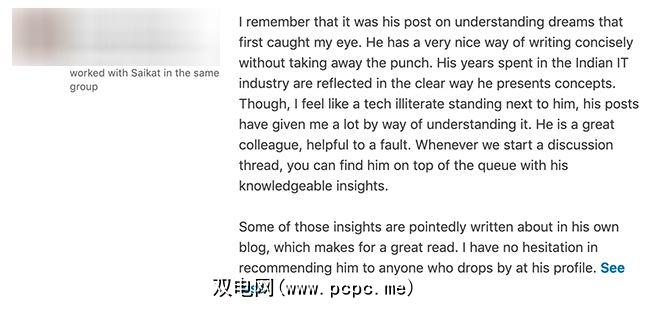 对于本文,我们决定重点介绍Saikat Basu的一些LinkedIn推荐示例,他恰好是PCPC.me编辑器。他与我们合作已经很长时间了,他确实知道怎么写。