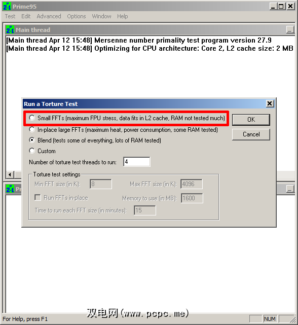 从Prime95“ 运行酷刑测试"中,确保选择“ 小FFTs