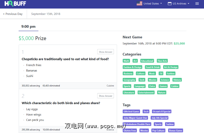 HQ Buff是另一个不错的资源,它记录了所有HQ Trivia游戏的所有问题和结果。显然,它没有10秒计时器,但是研究游戏的结构方式和问题表达方式非常有帮助。