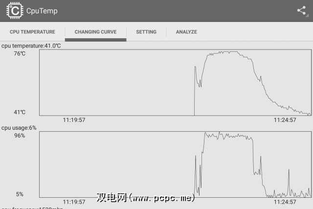 经过很短的密集游戏时间后,相机附近的区域变得很热。使用温度传感器应用程序可以发现Nexus 9采用了非常激进的热调节形式。当Nexus 9达到50C左右的温度时,它将CPU频率降至1,530MHz。