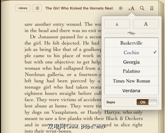 稍作调整后,我得到了一些我喜欢阅读的东西。您可以在几种字体,两种字体大小之间进行选择,打开和关闭棕褐色并控制亮度。菜单图标在那里,除非您以特定方式点击页面以使其消失。通常,我发现自己经常在那儿阅读。