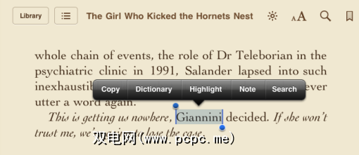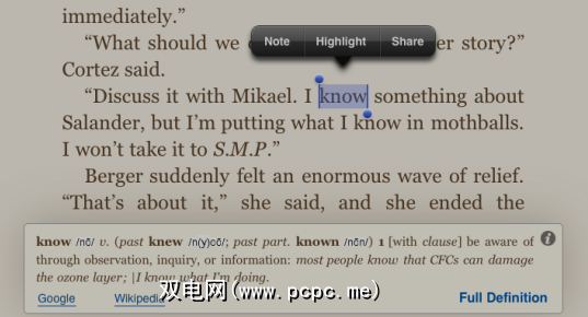 长按一个单词将使您可以选择突出显示该单词,添加注释或在Twitter或Facebook上共享。您还将在页面底部获得自动词典定义。
