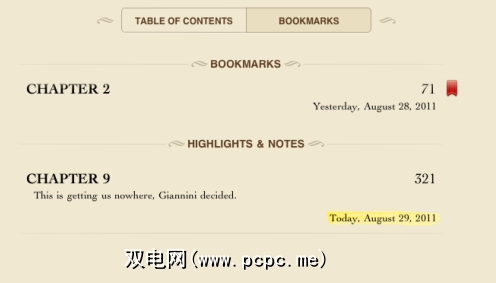 您还可以为页面添加书签,然后通过点击目录按钮然后查看书签来访问它们。您还将在这里看到您的重点和注释。