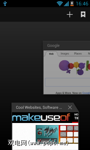 常规浏览器会摇动。在上方可以看到其选项卡式界面–选项卡实际上是大缩略图。您是否注意到Google缩略图偏向侧面并且略微透明?那是因为我想向您展示ICS中引入的一个很酷的手势:您可以将这些缩略图向侧面滑动以将其关闭。