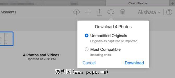 选择一堆照片,然后点击下载所选项目 strong>工具栏按钮。是否要下载优化的图像(包括编辑内容)而不是未修改的原始图像?将鼠标悬停在工具栏按钮上,而不是单击它。然后,单击出现的微小向下箭头,然后选择最兼容选项,然后再下载。