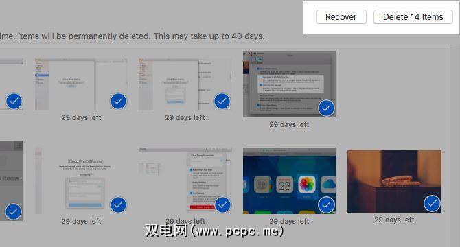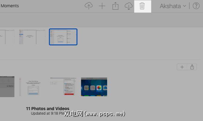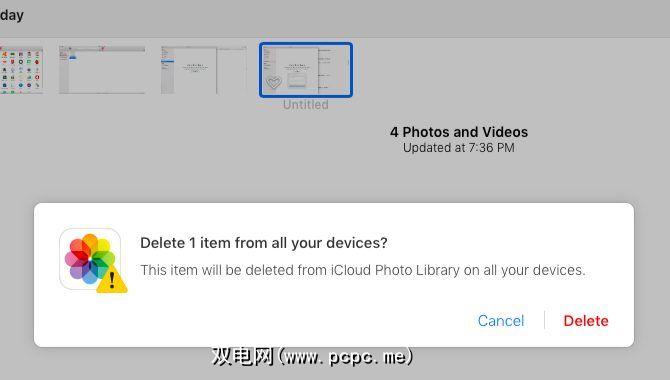 要在iCloud.com上删除照片,请选择它并点击 Delete >工具栏按钮。再次令人讨厌的是,没有简单的方法可以选择多张照片。如果只选择几张照片,则 Cmd -单击即可。但是,如果您要浏览一页又一页的照片,这将花费很长时间。