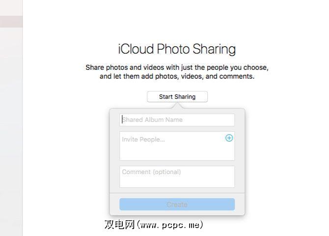 这时(在macOS和iOS设备上)“照片"应用都会出现一个新部分:共享。在本部分中,您会找到一个开始共享按钮,以帮助您创建第一个共享相册。 (向前,您需要使用共享相册部分中的加按钮来创建更多相册。)
