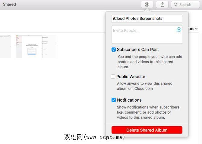 在Mac上,从“照片"的侧边栏中,选择要允许任何人查看的共享相册。接下来,点击工具栏中的人按钮,然后在弹出的选项框中选中公共网站的框。