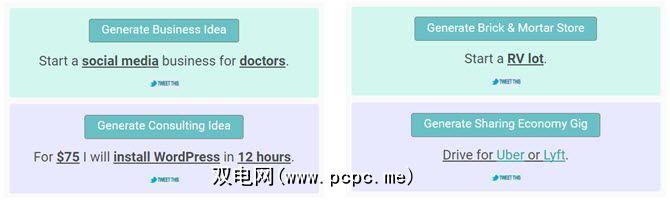 KopywritingKourse的商业创意生成器提供了四种不同的商业创意类型。您可以查看一般业务,咨询,实体店或经济共享的概念。只需单击所需类型的按钮,即可查看随机提示。以下是一些示例: