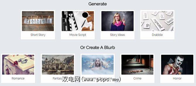 当您进入Plot Generator网站时,您会看到各种选择,从短篇小说,电影脚本到流派特定的Blub。如果您已经有故事的想法,但需要帮助,请单击其中一种类型。您可以从幻想,浪漫,犯罪或恐怖等类别中进行选择。