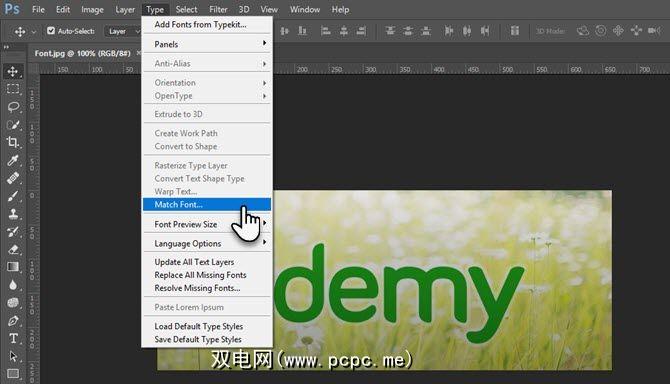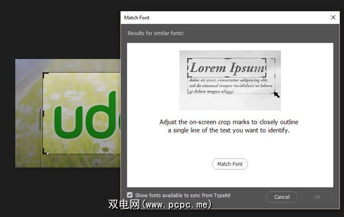 匹配字体在Adobe Photoshop CC 2015和更高版本中可用。它与Adobe Typekit一起使用,可帮助您查找字体并在您自己的作品中复制它们。您必须使用Creative Cloud用户名在线登录Adobe Typekit。