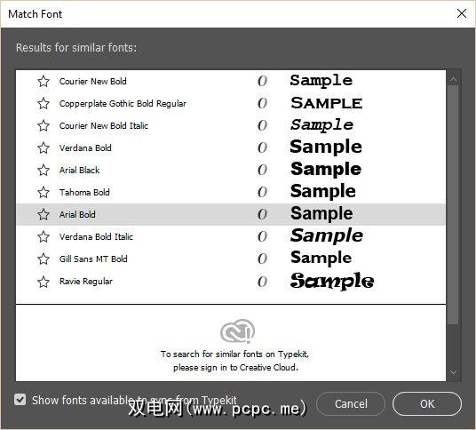第3步。显示显示可用于从Typekit同步的字体的小框。 Photoshop将显示更多匹配项供您选择。这是一个巨大的帮助,因为Typekit具有来自铸造合作伙伴的数千种字体。可能是与您尝试识别的字体完全匹配或近似的字体。