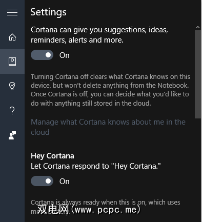 您也可以在不触摸鼠标或键盘的情况下启动Cortana,但是首先需要启用“嘿Cortana"语音识别功能。打开 Cortana ,点击左侧的笔记本图标,然后点击设置。现在点击 Hery Cortana 滑块将其打开打开。
