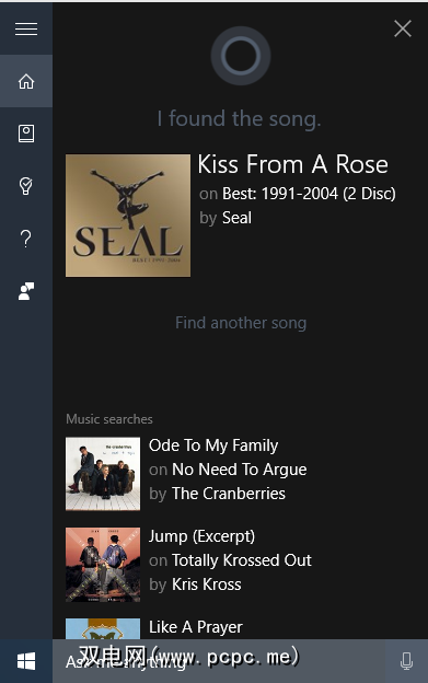 启动后,Cortana说“问我什么。"只需问她以下任何一个问题:这是哪首歌?,正在播放什么歌曲?,这首歌的名字是什么?或现在正在播放什么?。