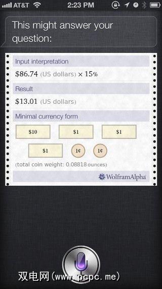 Siri还使用另一项服务,称为Wolfram Alpha提供查询的特定答案,而不是给您大量文章和其他文档进行搜索。因此,假设您在一家商店中,并且想知道产品销售可节省的百分比。例如,您可以举起iPhone并问:“ 86.74美元的15%是多少。"