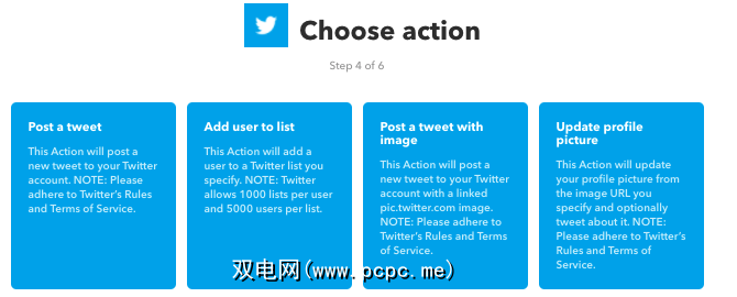 现在,您必须选择检测到该触发器时要执行的操作。在上述情况下,这将发布到Twitter ,因此请单击Twitter图标,然后选择“ 发布推文"。自定义tweet文本,然后单击创建操作。
