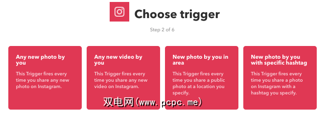 例如,如果您希望您的Applet为“如果我将其发布到Instagram,然后将该照片发布到Twitter",则您的触发器将为在Instagram上发布新帖子,因此,请单击Instagram徽标,然后选择“ 您的任何新照片"。
