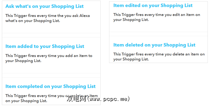 如果您要设置自己的Applet,则可以使用触发器询问Alexa购物清单上的内容。您还可以添加,编辑或删除产品,然后将商品标记为已完成。