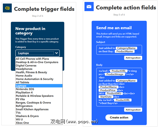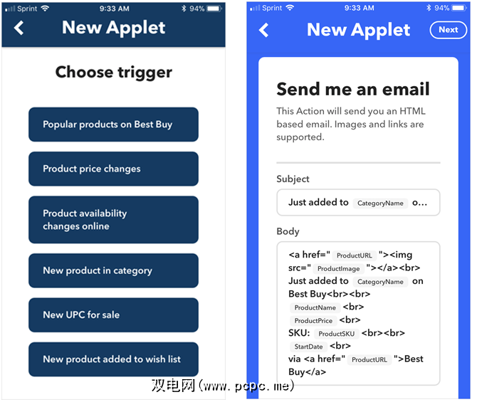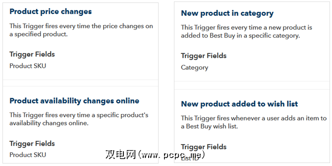 如果用户将商品添加到其愿望清单中,则可以在某个类别中使用新产品,商品可用性的更改或价格的更改都是您可以在自己的Best Buy Applet创建中使用的触发器。