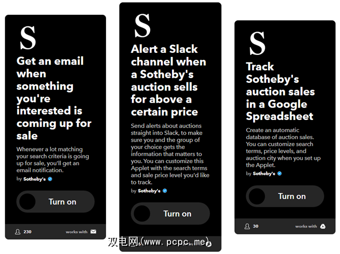 如果拍卖是您最喜欢的购物方式,则将IFTTT与苏富比联系起来。有了许多不同的触发因素,您将永远不会错过新的可用地段的开始竞标或所选位置的拍卖。以下是一些有用的Applet。而且,请记住,您可以根据自己的特定需求进行调整。
