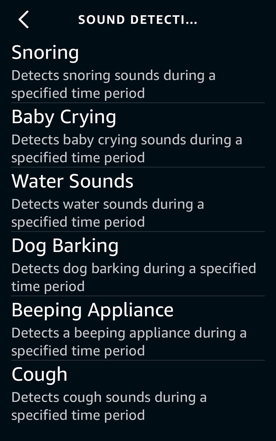 目前,Alexa 可以识别出六种声音:打鼾、婴儿哭声、水声、狗吠声、电器发出哔哔声和人们咳嗽声。您还可以选择希望 Alexa 在一天中的哪个时间聆听这些声音。例如,您可能不希望 Alexa 白天听到打鼾声,或者让您的 Amazon Echo 在晚上对狗吠声做出反应。
