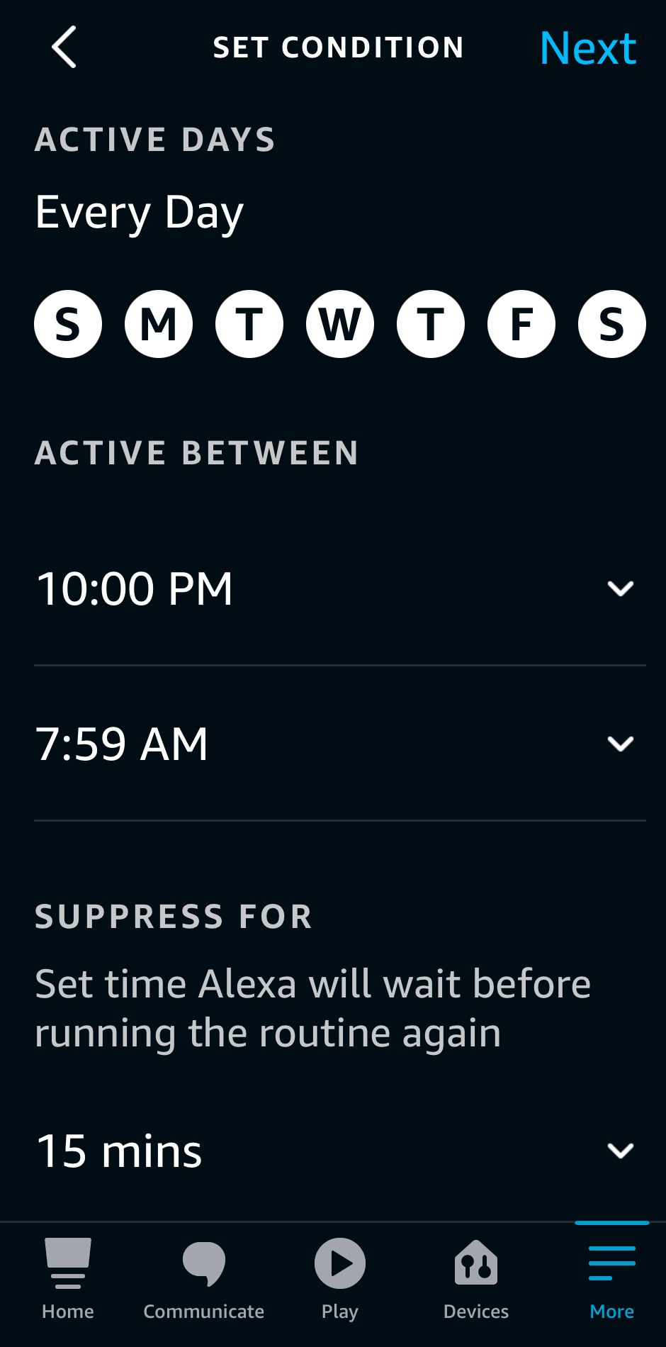 在下一个屏幕上,您将能够选择希望 Alexa 在一天中的哪些时间聆听所选声音。默认情况下,某些声音会填充特定时间,但您可以通过轻按“更改”然后轻按“下一步”将时间范围更改为您想要的任何内容。