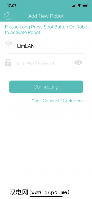 创建帐户后,请按住现场清理按钮( A7上的螺旋形)。这将激活它并使它为配对做好准备。最后,输入Wi-Fi连接的密码,这会将A7与该应用配对,并使其连接到Wi-Fi网络。