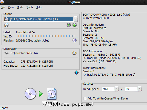 读取模式显示有关光盘的信息,然后选择图像的目标文件。简单!